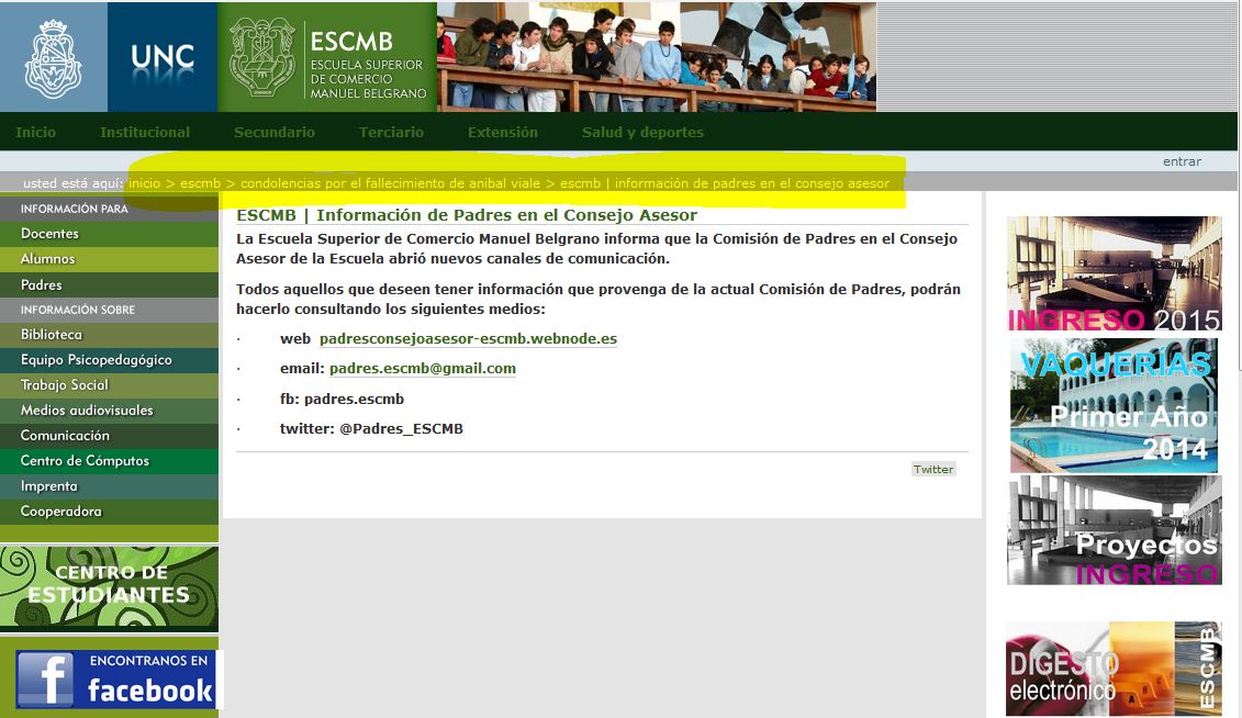 Proyecto Padres Web.pdf (306 kB) El proyecto fue aprobado, figura en la web anterior de la escuela, en un lugar un tanto díficil de ubicar, como se puede ver en la captura de pantalla...